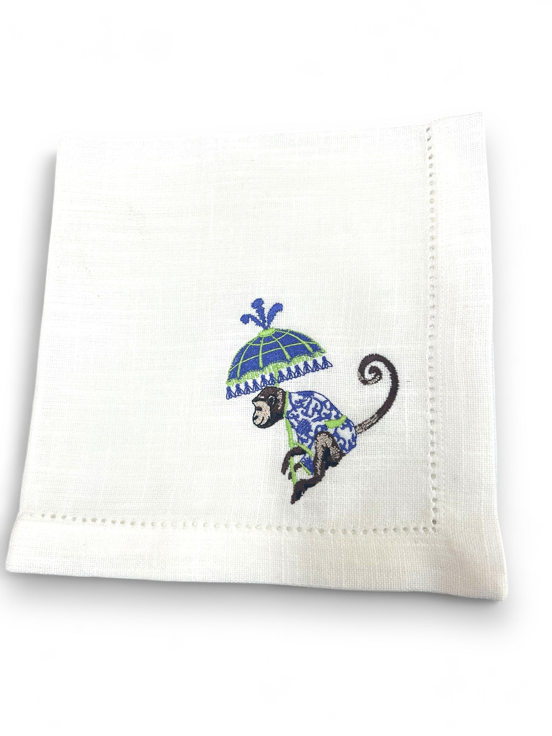 We’re offering a beautifully embroidered linen-cotton napkin featuring a charming design of a monkey holding a parasol. This elegant piece is perfect for adding a touch of sophistication and whimsy to your table décor.