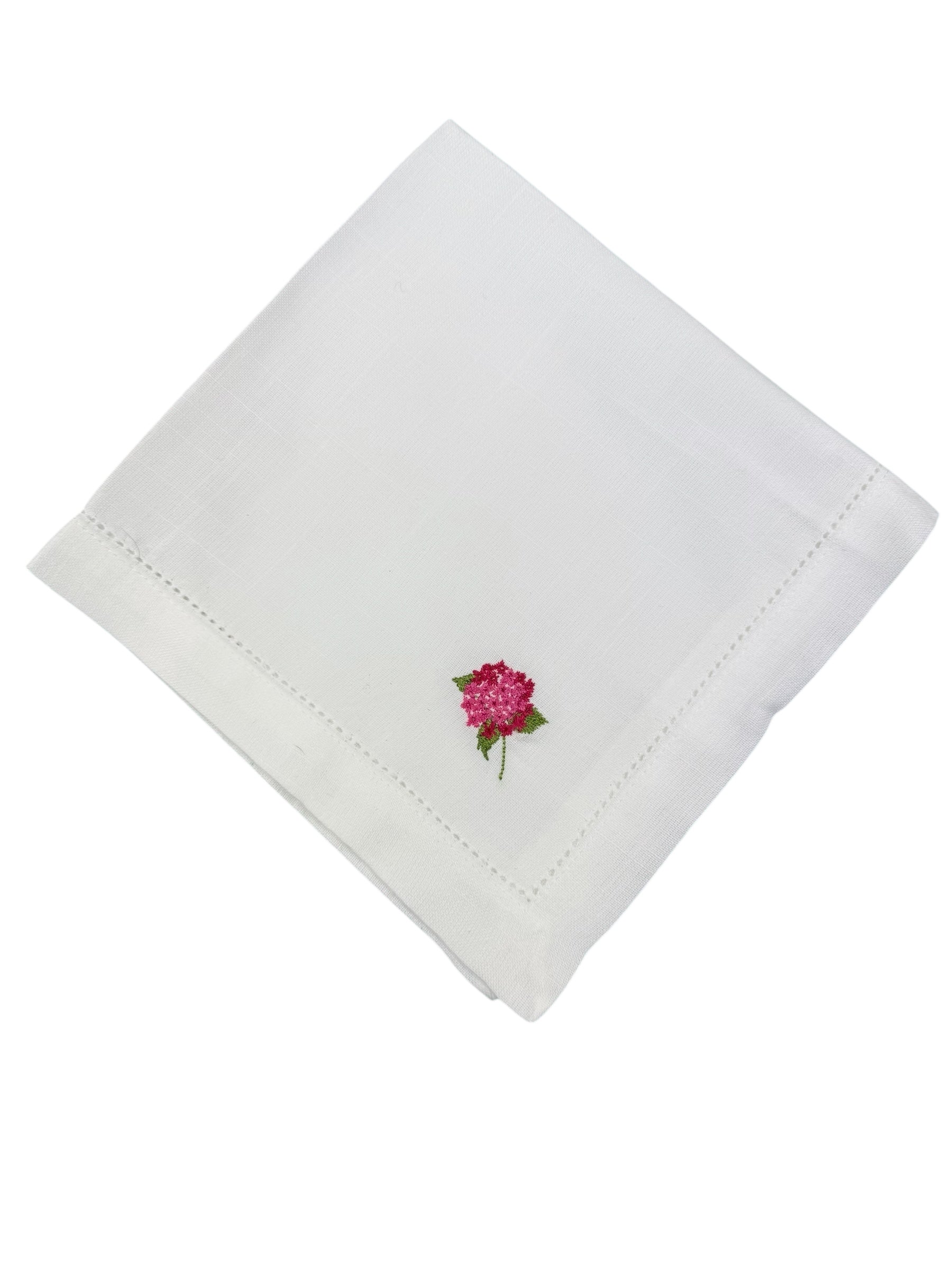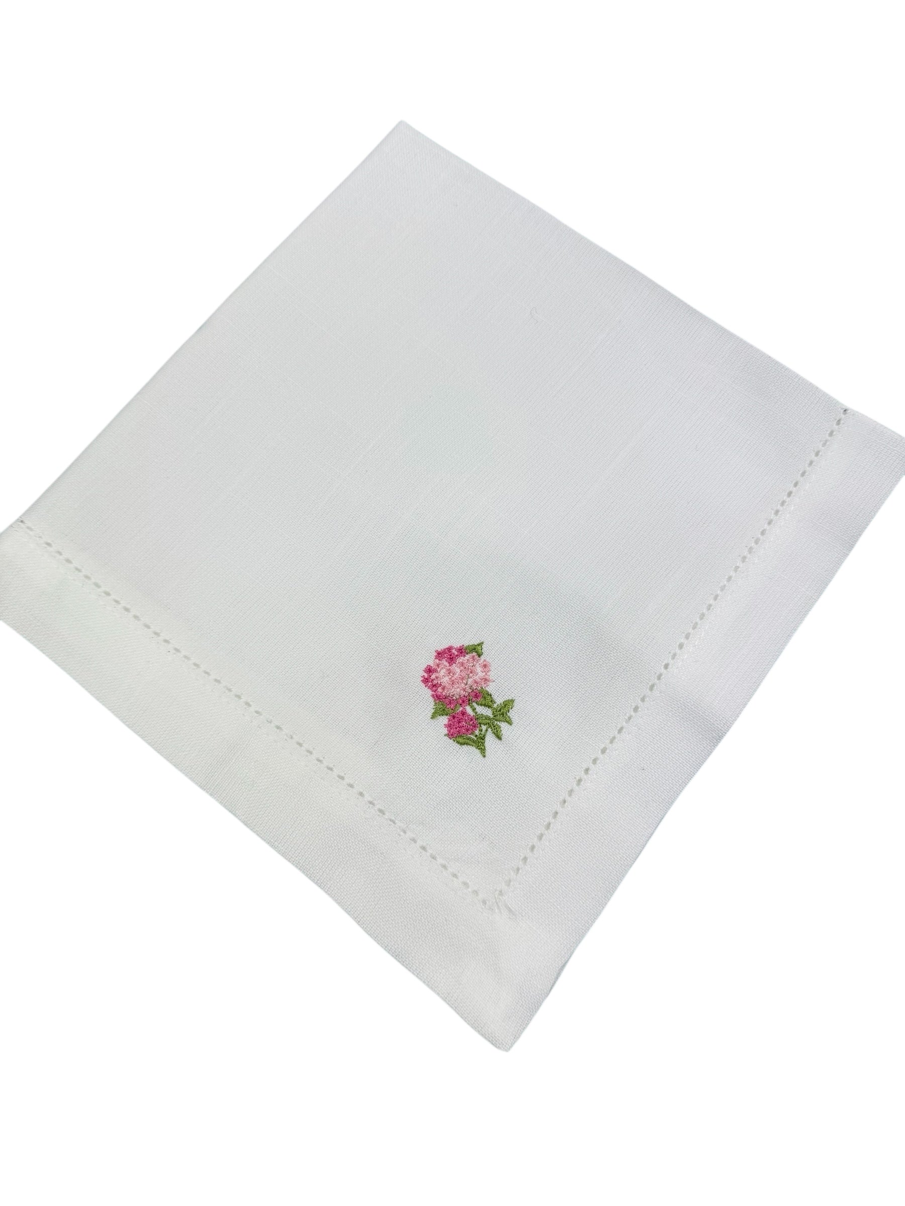 Handcrafted white linen napkins featuring a delicate embroidered bloom in soft colours.